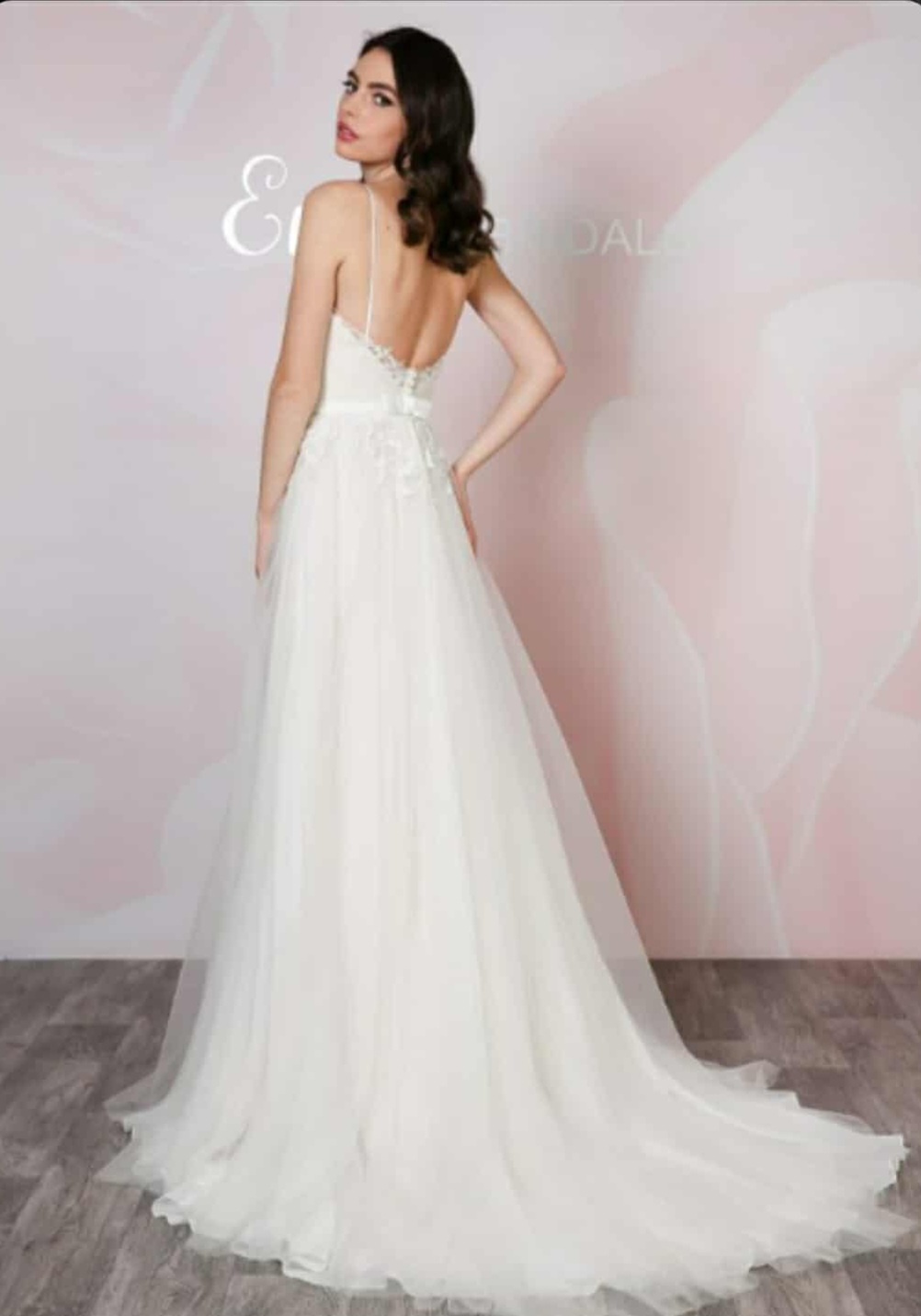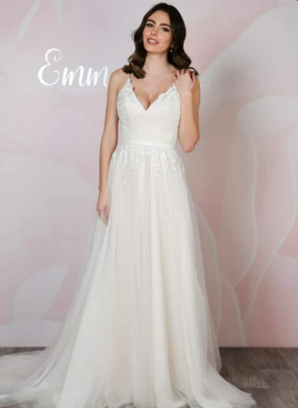 Description: Daisy is a pretty lace and tulle wedding dress. She features, plain satin narrow straps, bodice with a v-neckline, flattering pleating, and a low back with lace applique detailing. The lace appliques over the bodice continue onto the tulle skirt. A pretty satin belt with bow detail to the back, completes this floaty gown.