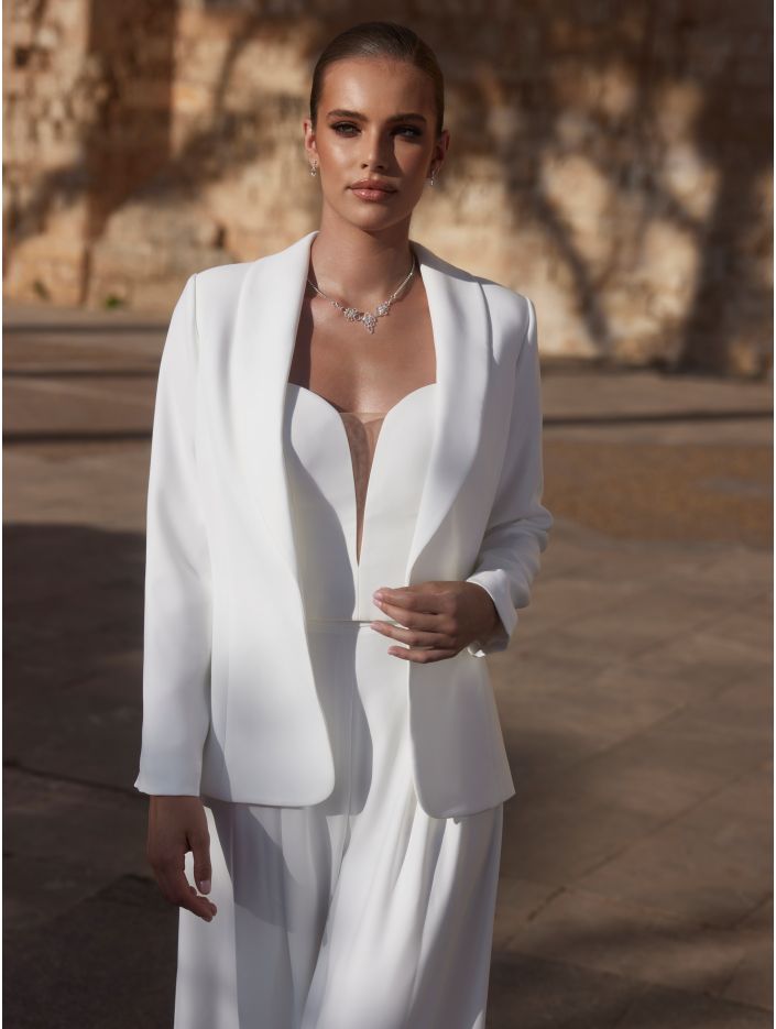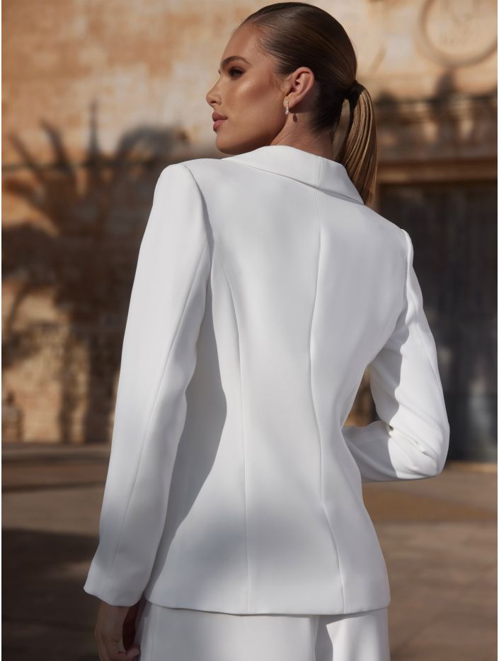 Description: Soft crepe blazer-style edge-to-edge jacket with collar and full-length sleeves.