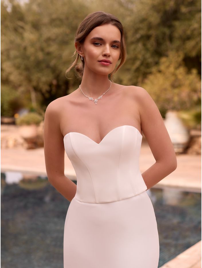 Description: Bridal corset top in soft crepe, with sweetheart neckline and button detailing to back.