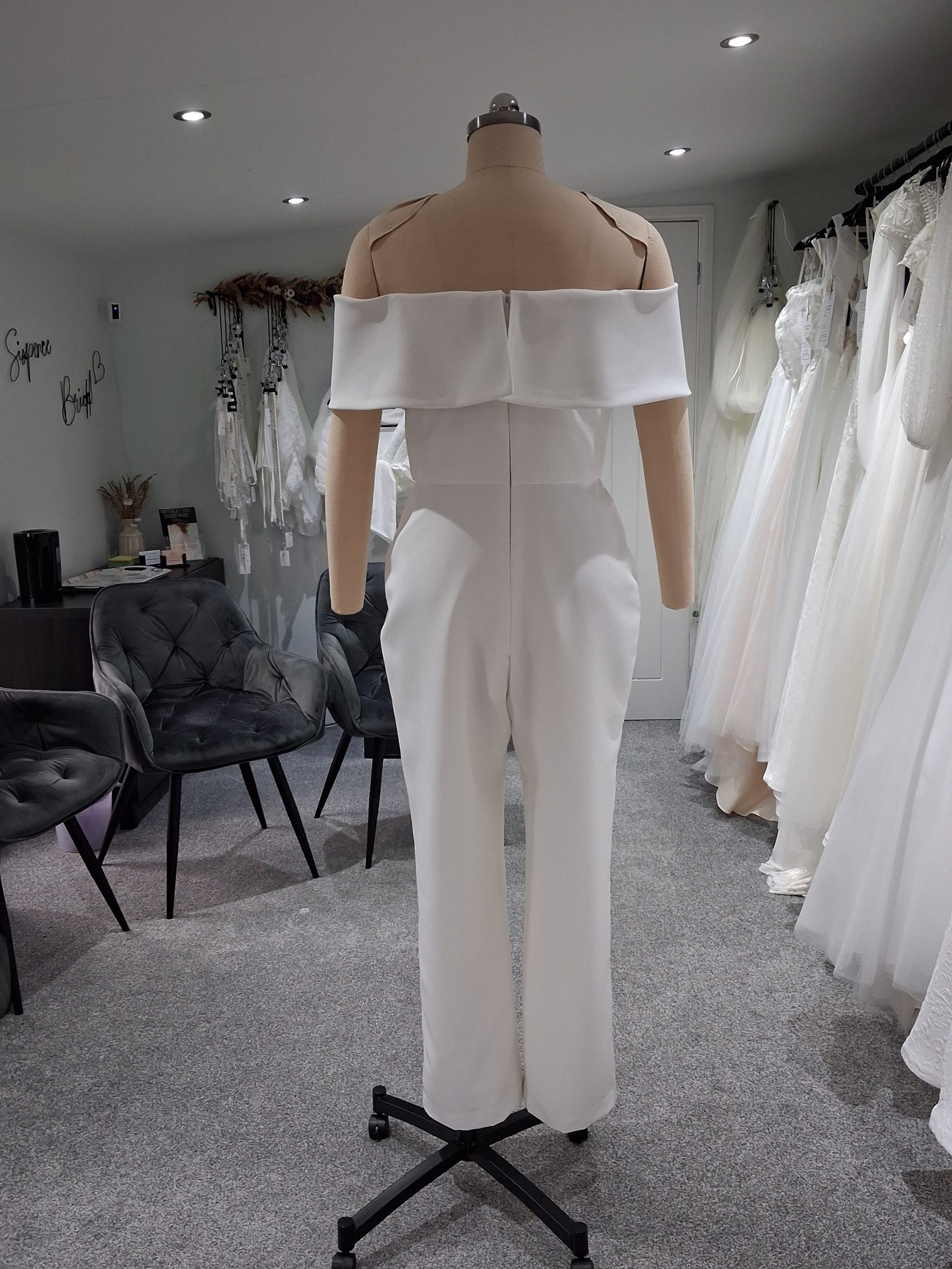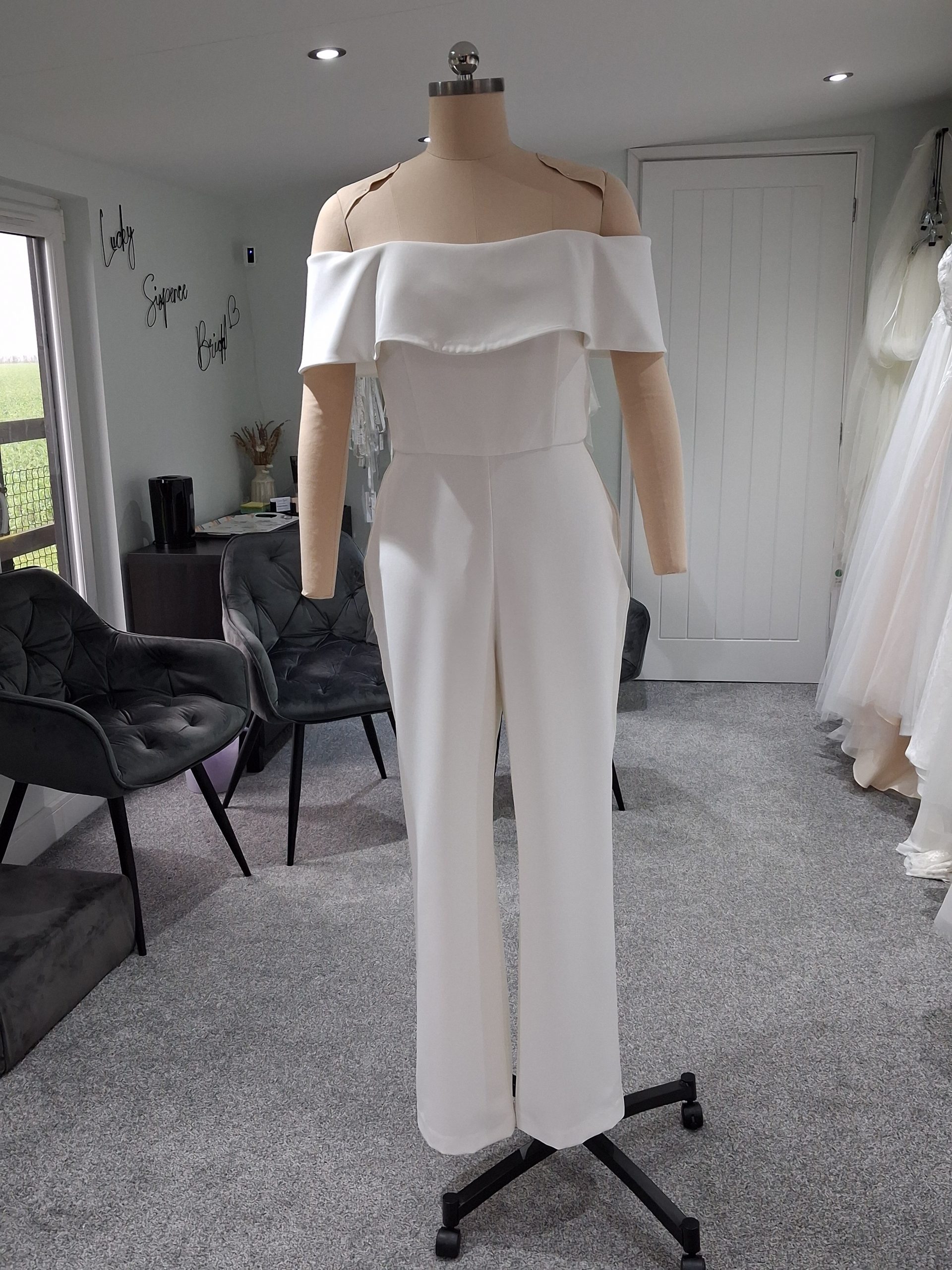 Evie is available to try in-store to determine if the style suits. This design can be made in other fabrics of your choice (subject to suitability), and the price will change depending on the fabric(s) chosen. The design can be adapted to your preferences, so the neckline can be changed, the collar replaced with different sleeve styles, and lace appliques or other embellishments can be added.