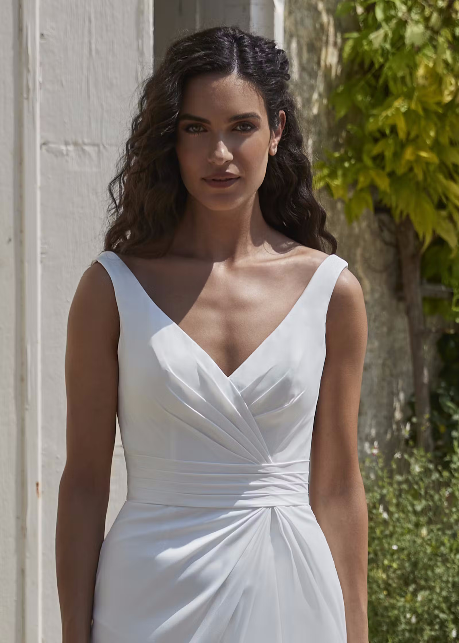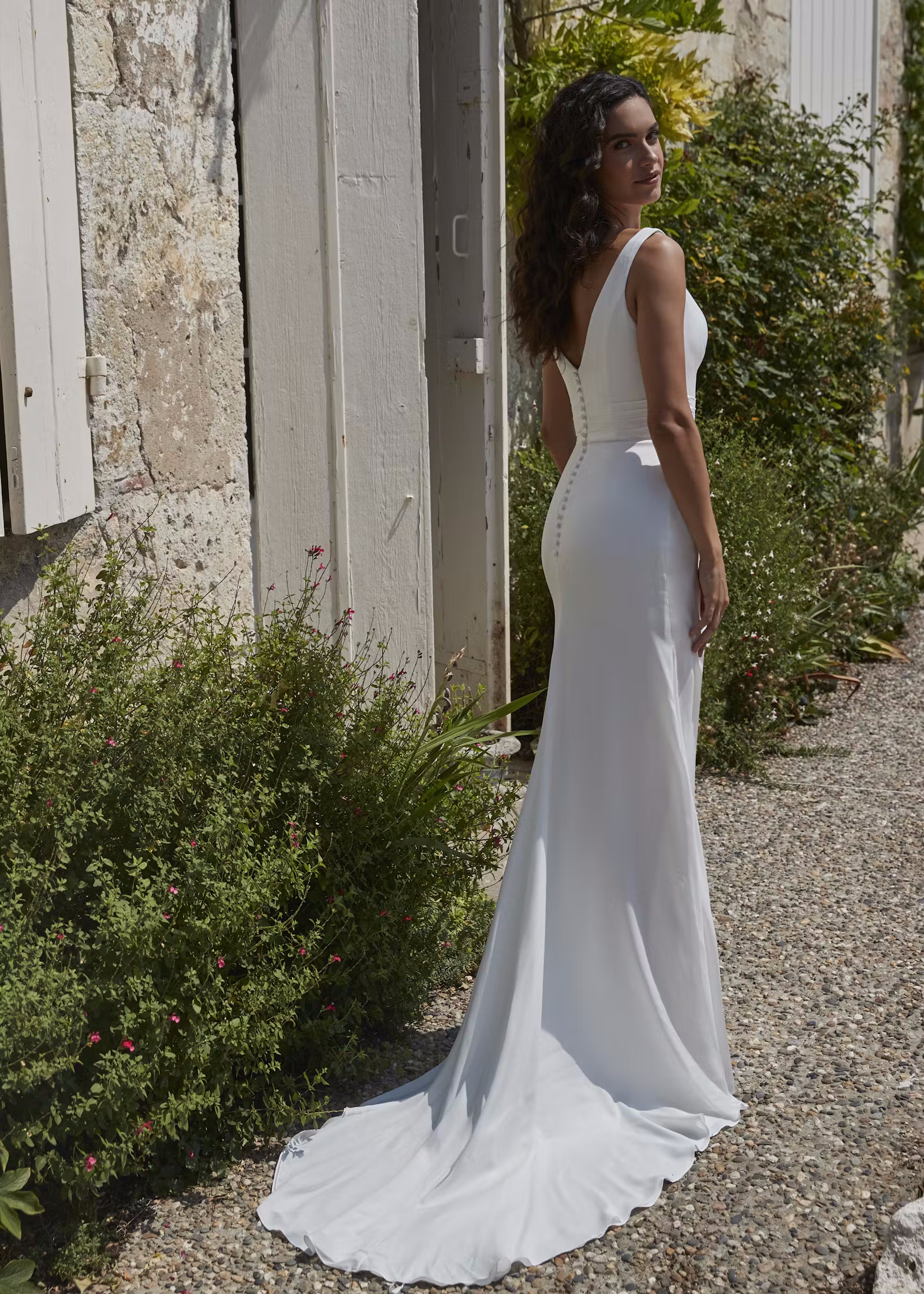 Description: PB260 is a plain crepe fit-and-flare bridal gown. The cross-over v-neckline bodice features flattering pleating, and is finished with a wide pleated waistband. The skirt has gathering at the waist above a sexy leg split. The back features button detailing over the zip, and a sweeping train.