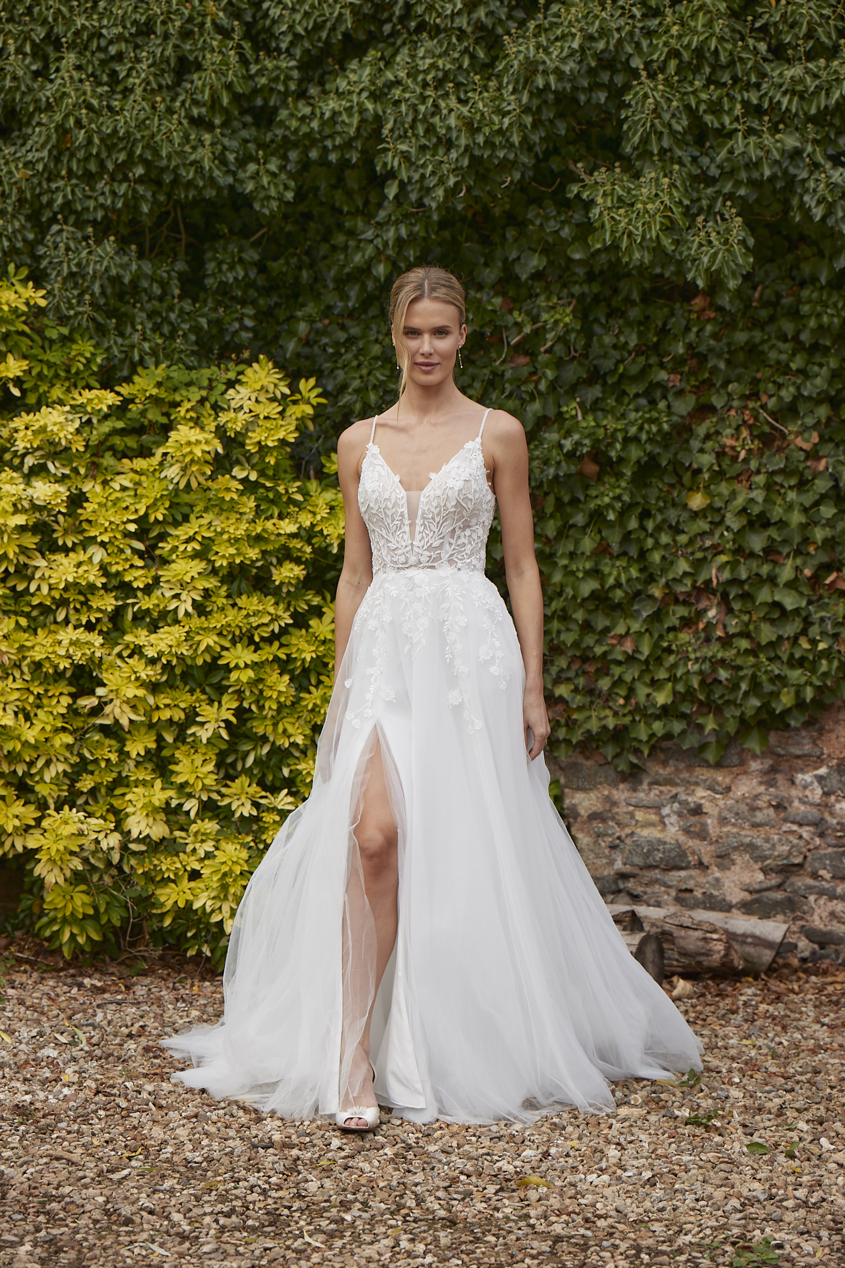 Description: PB313 features a beaded lace v-neck bodice with narrow beaded straps, and button/loop closure. The lace appliques continue onto the top of the A-line tulle skirt, which also features a flattering leg split.