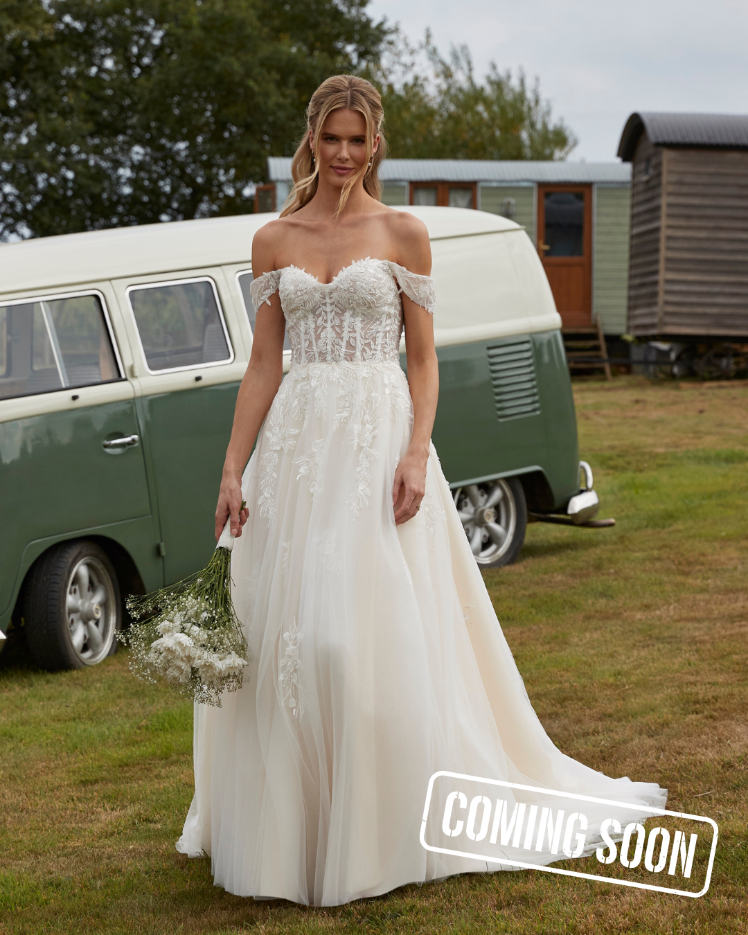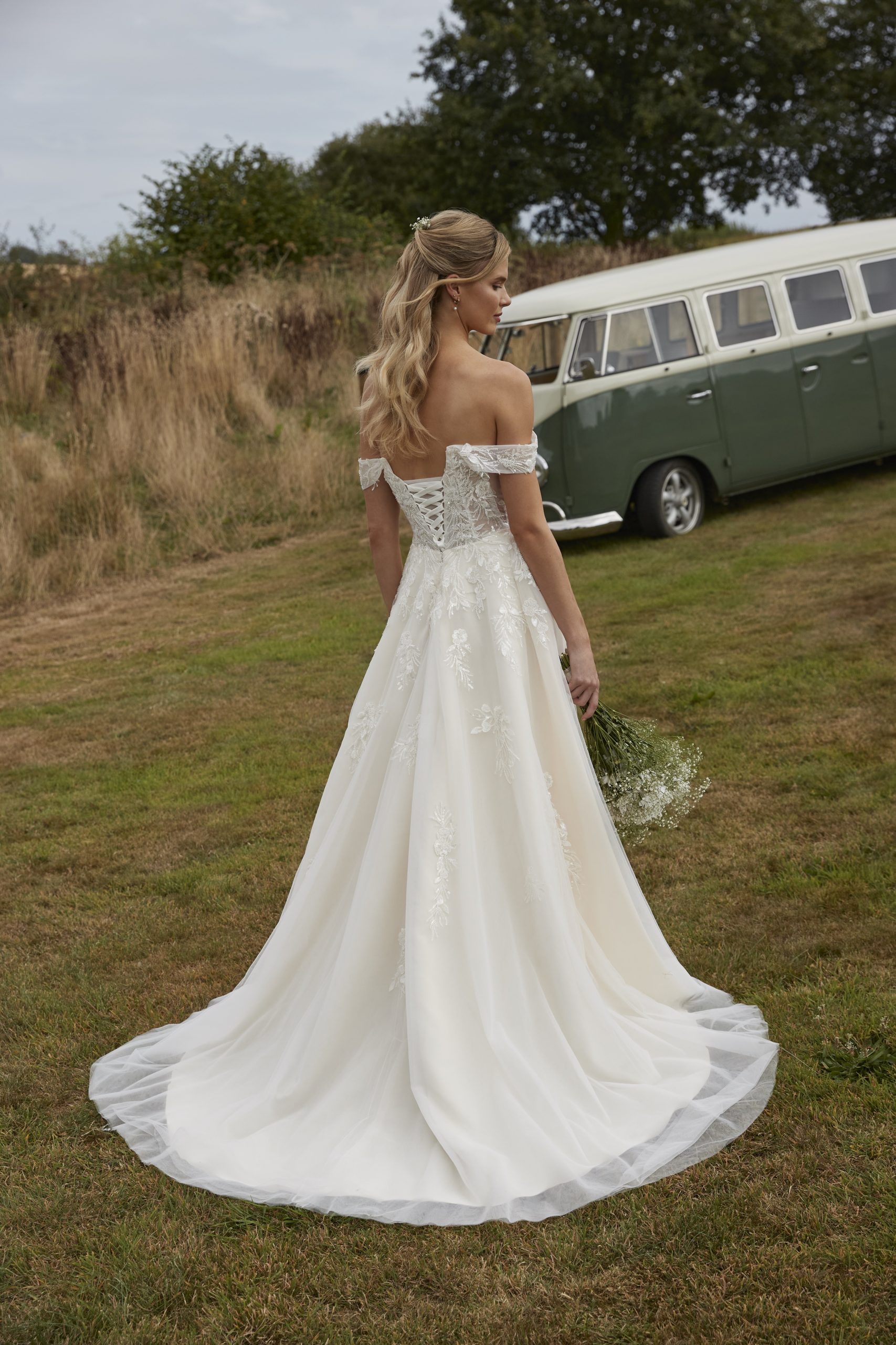 Description: PB92510 is a pretty off-the-shoulder bridal gown featuring a sweetheart neckline and corset tie back. The lightly beaded and sequinned lace appliques give this gown a soft shimmer, which continues over the skirt and down the train.