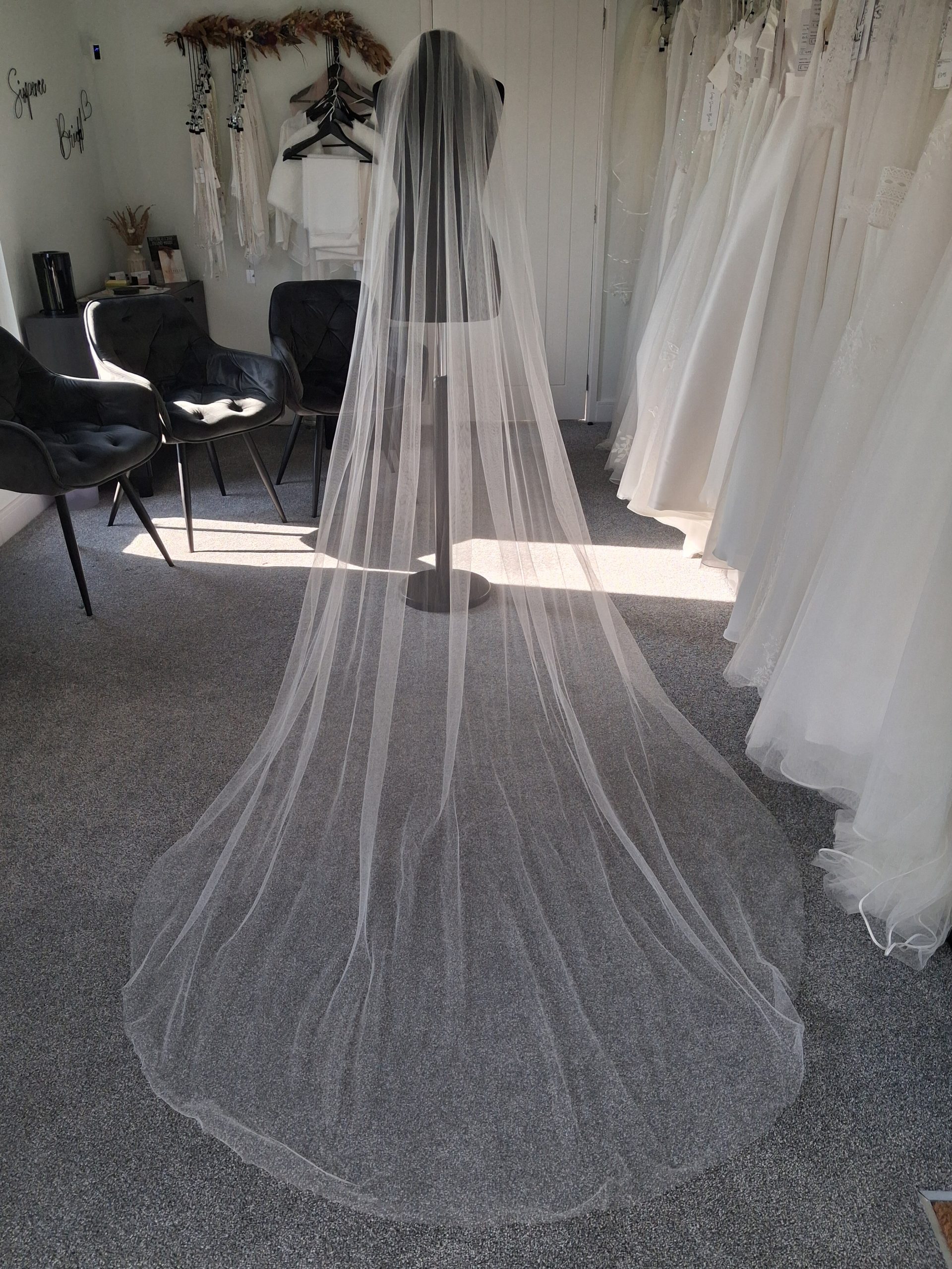 Description: Plain tulle, cathedral length, single-tier veil with a cut edge.