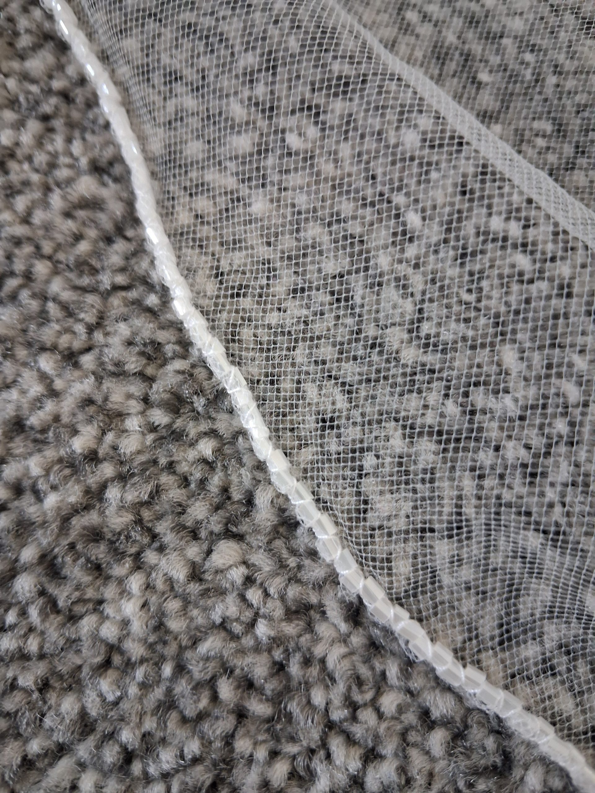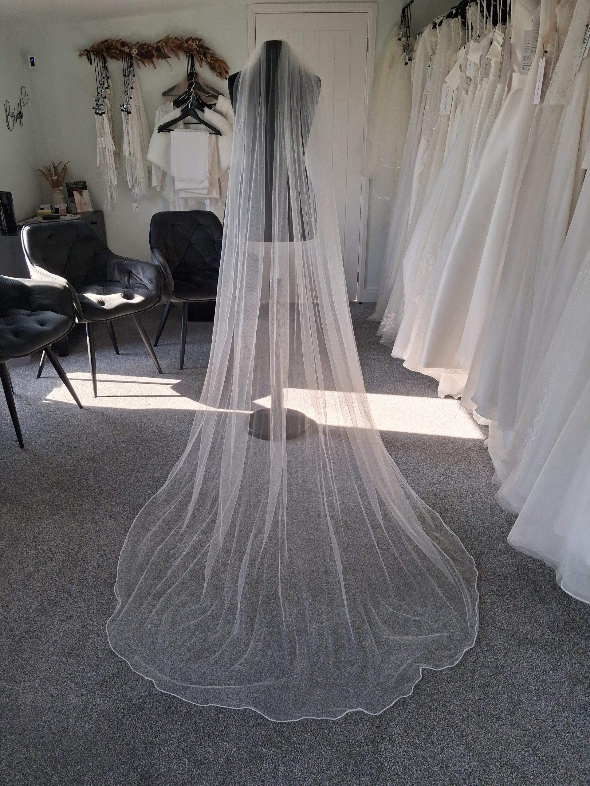 Description: Plain tulle, chapel length, single-tier veil with a beaded edge.
