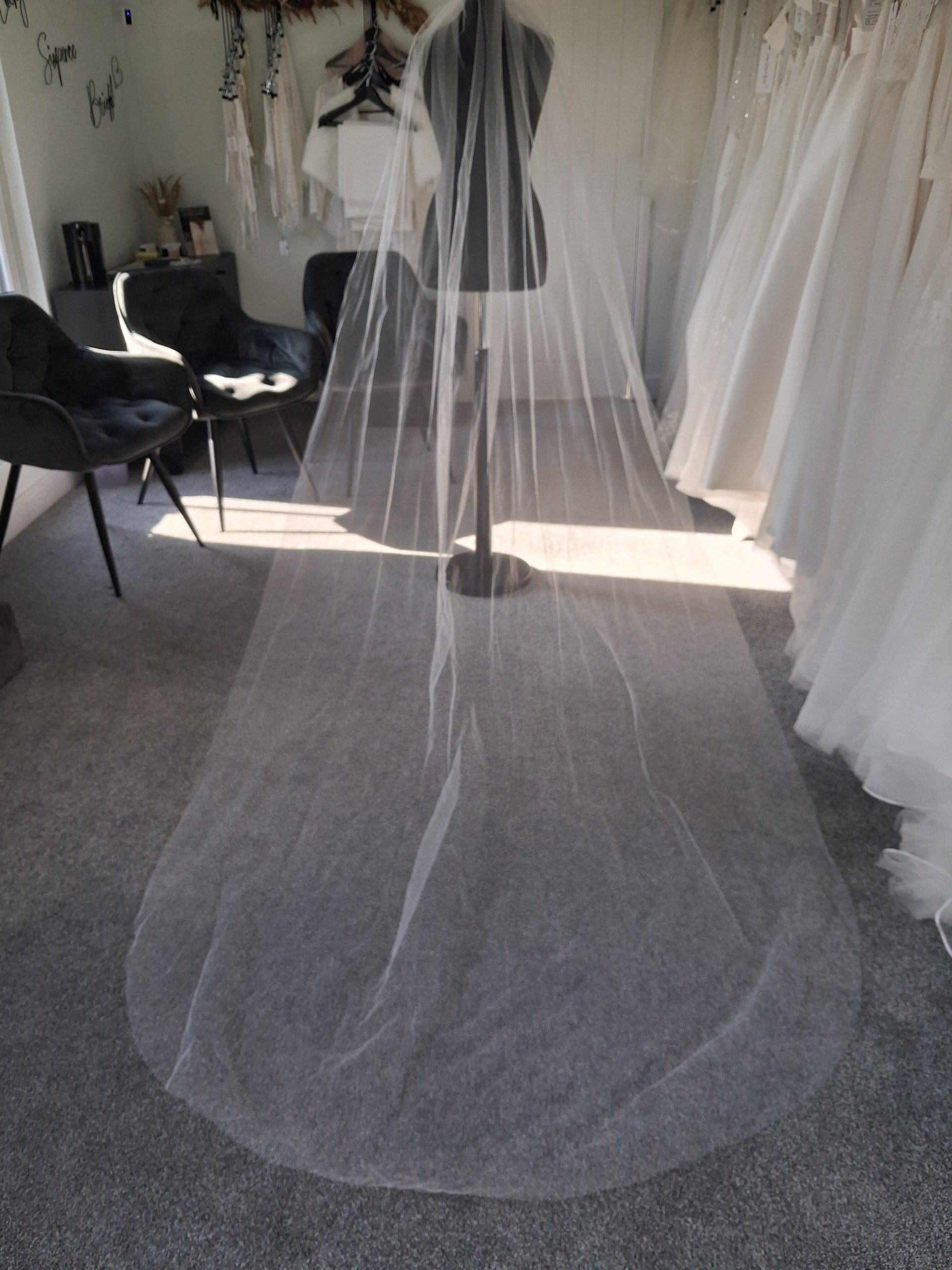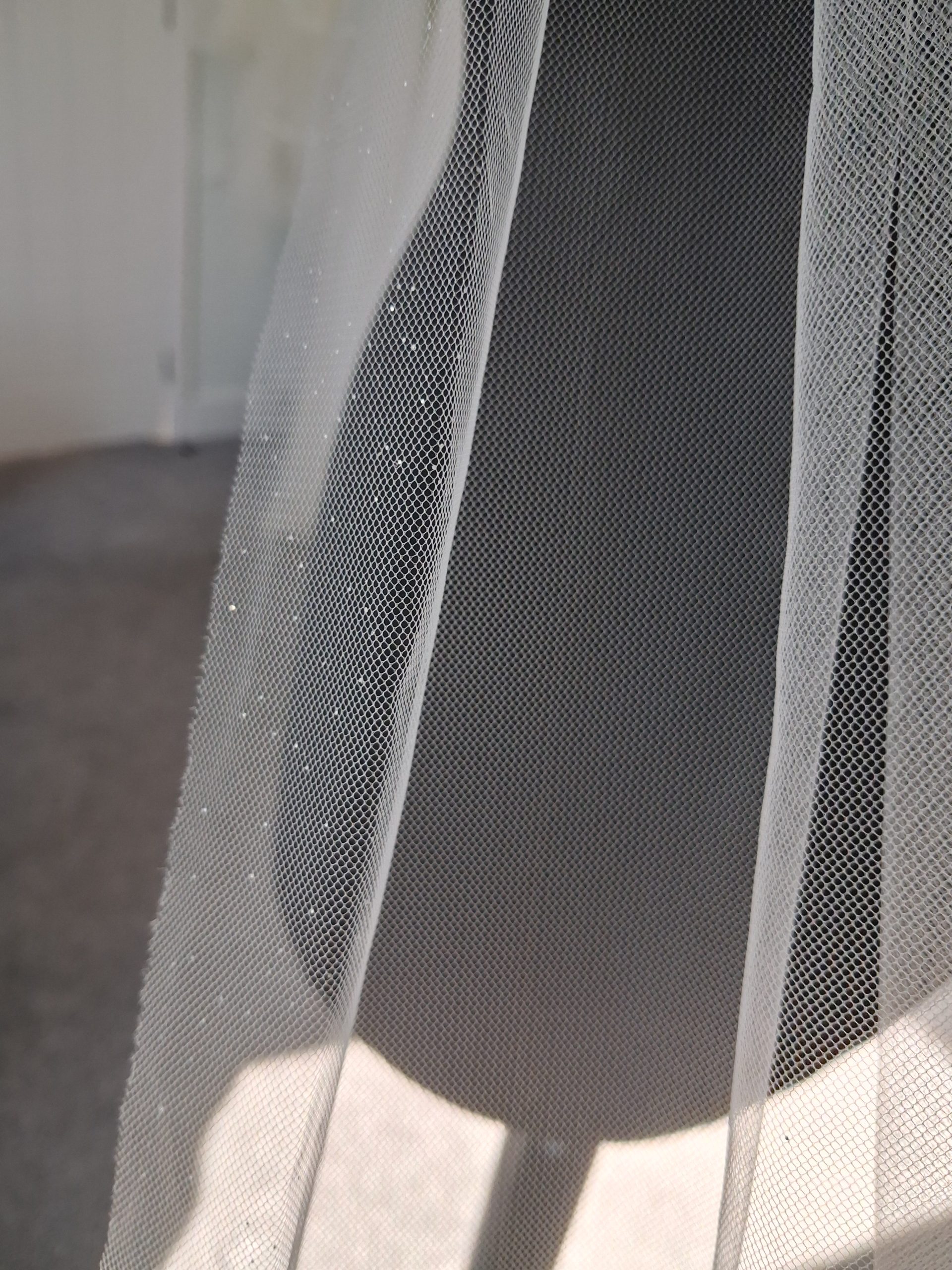 Description: Glitter tulle, chapel length, single-tier veil with a cut edge.