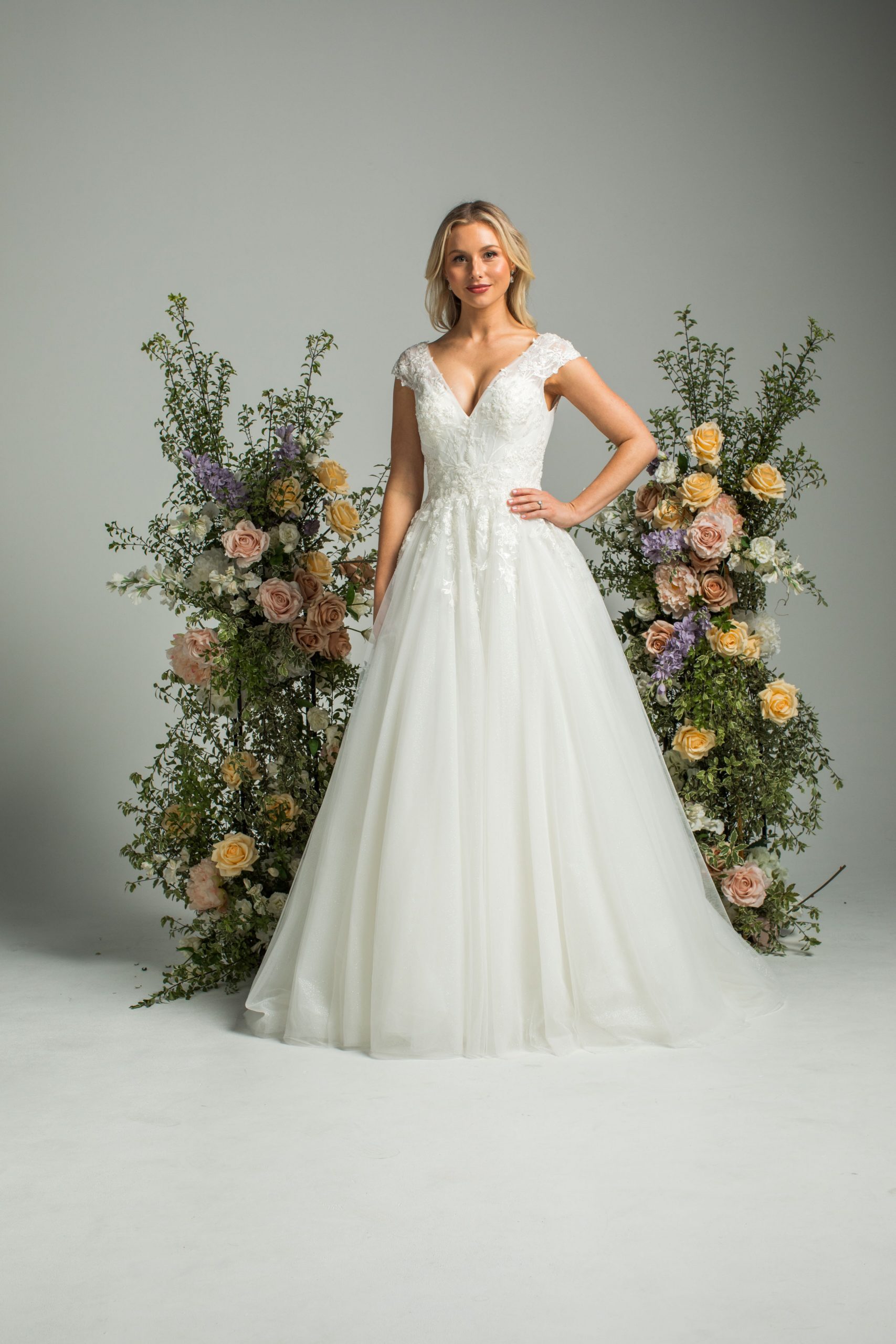 Description: Staring at the Sun is a beautiful full A-line gown (bordering on ballgown) featuring an v-neckline bodice with cap sleeves, and a low back. The bodice is covered in lace appliques, which continue over the waistline and down onto the full gathered skirt.