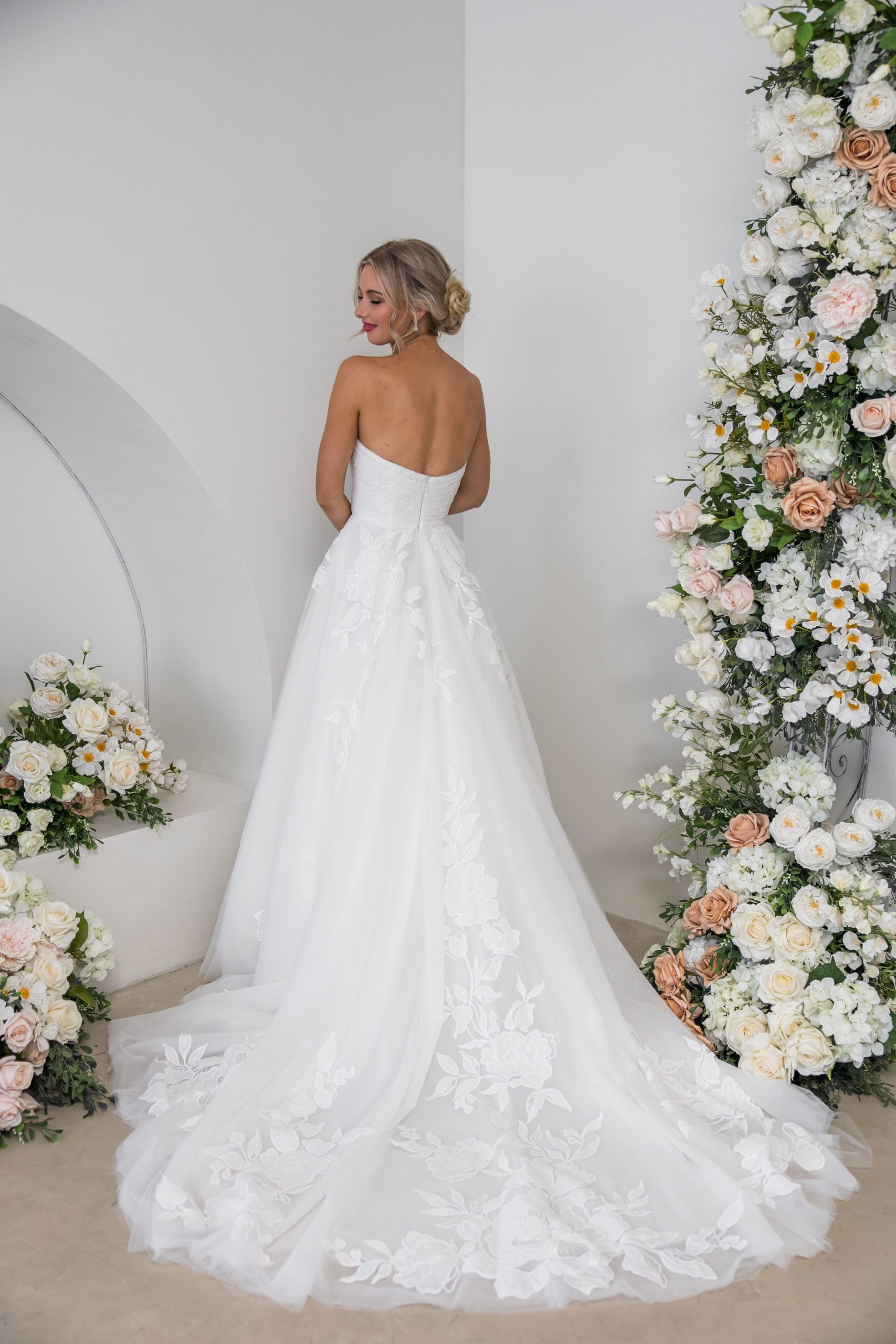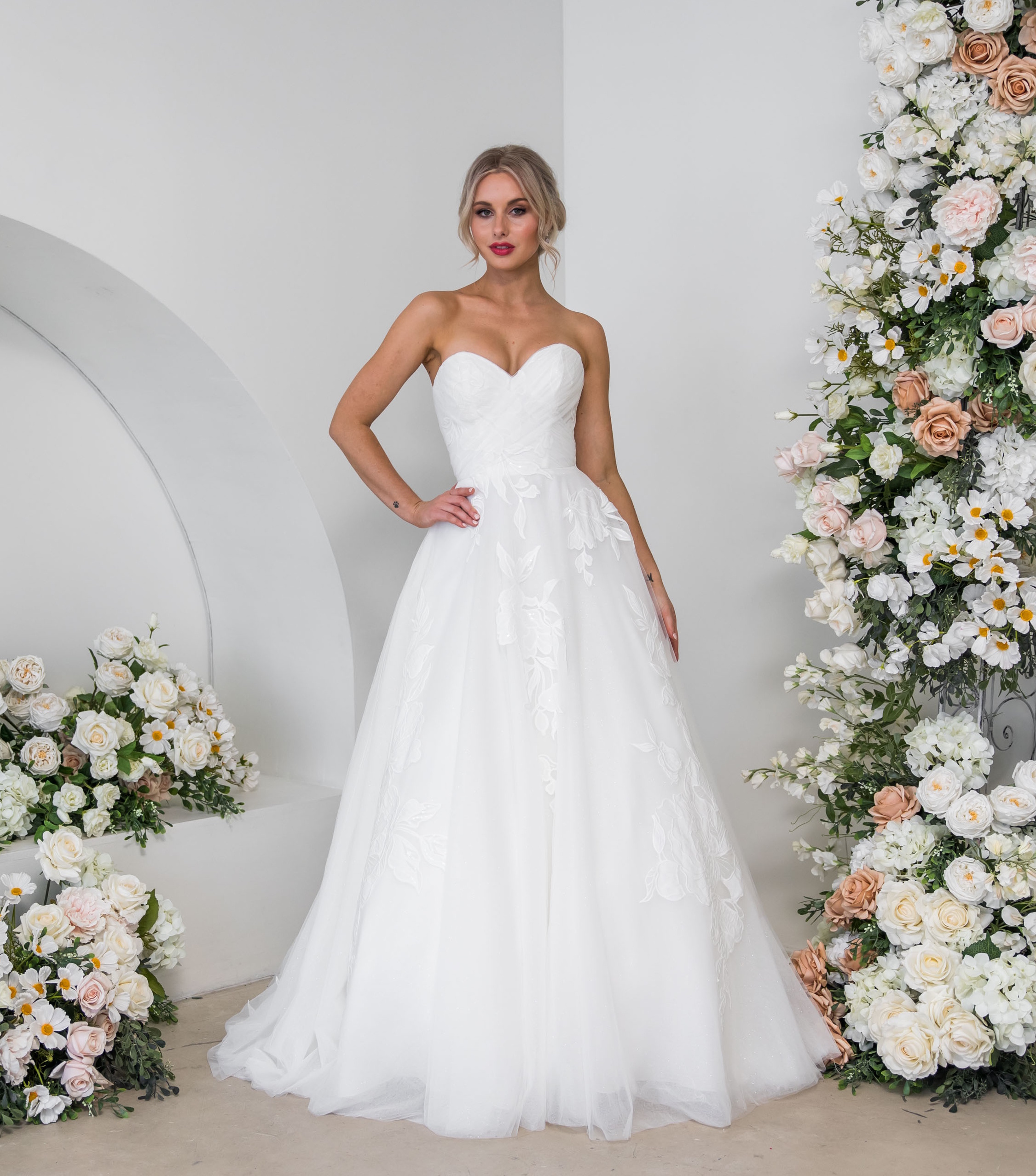 Description: Wonderful World is a gorgeous full A-line gown (bordering on ballgown) featuring a strapless bodice with a sweetheart neckline and soft tulle pleating, and a full tulle skirt. The large floral lace detailing brings this gown bang up-to-date, and the subtle sparkle layer adds a gorgeous shimmer. This gown is made to make you feel like a princess, and she will most definitely wow!